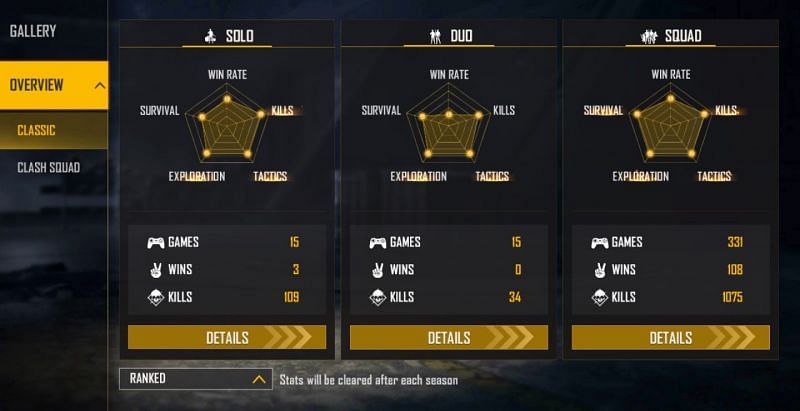 The YouTuber has contested in 15 solo games and has three victories, which comes down to a win ratio of 20.00%. In the process, he has 109 kills for a K/D ratio of 9.08.
