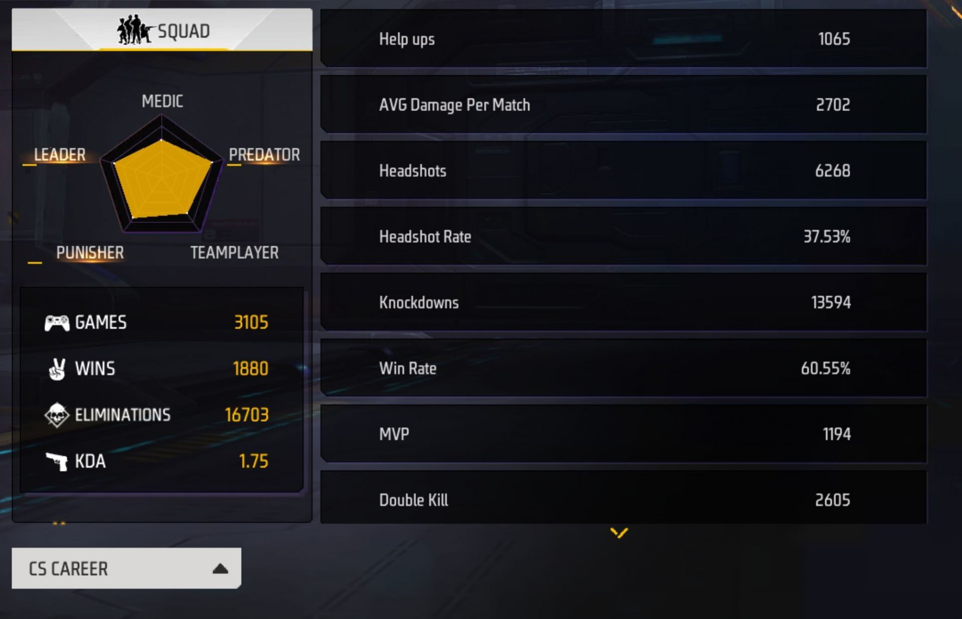Amitbhai has featured in 3105 Clash Squad matches, and his team has prevailed in 1880 of them, translating to a win rate of 60.55%. He has 16703 frags, 6268 of which were headshots, generating a KDA of 1.75 and a headshot percentage of 37.53%.