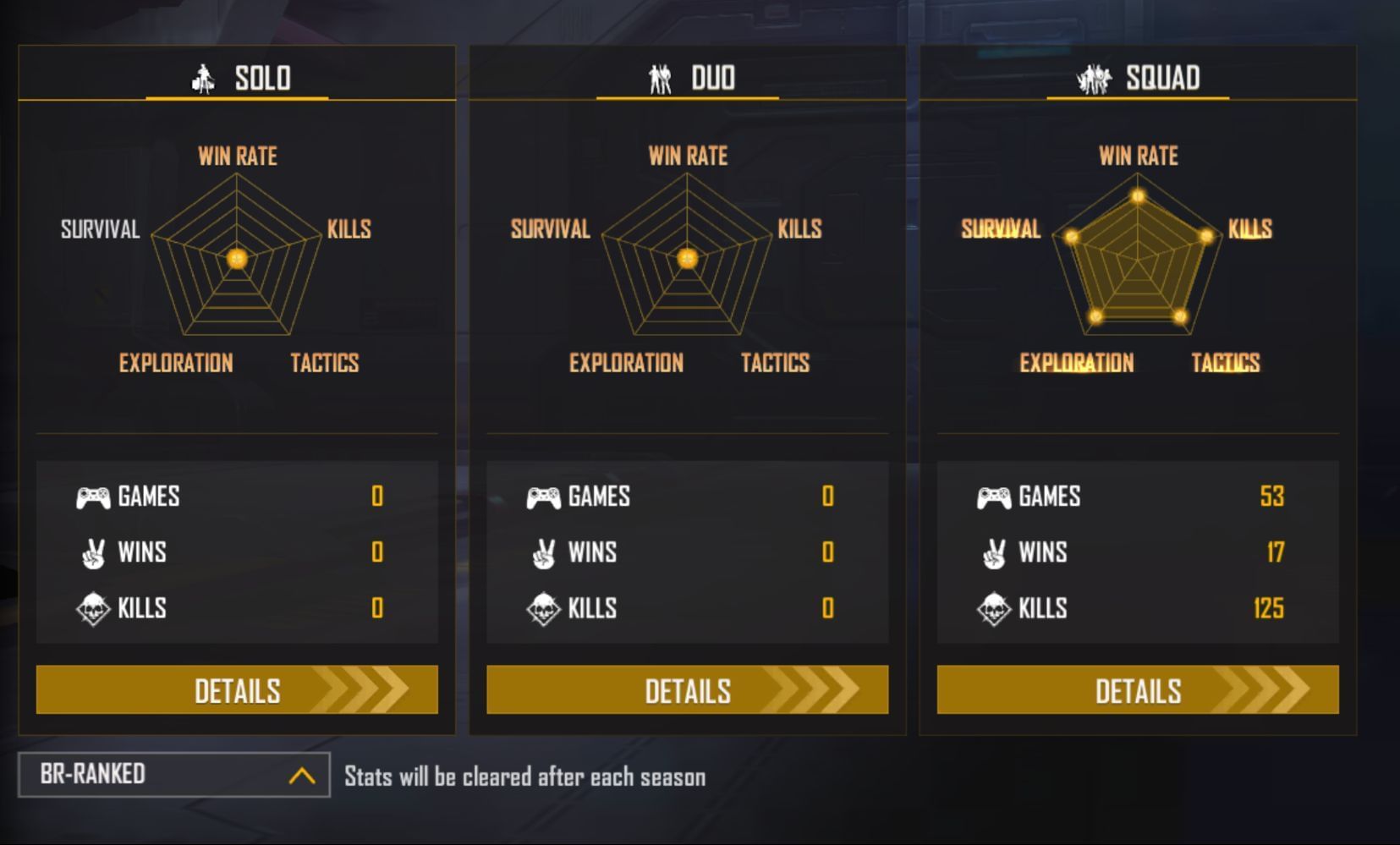 The YouTuber has played 53 ranked squad games in this Free Fire Ranked Season 27 and bettered the opposition 17 times, which comes down to a win rate of 32.07%. He has netted 125 kills to the profile, corresponding to a kill-to-death ratio of 3.47.