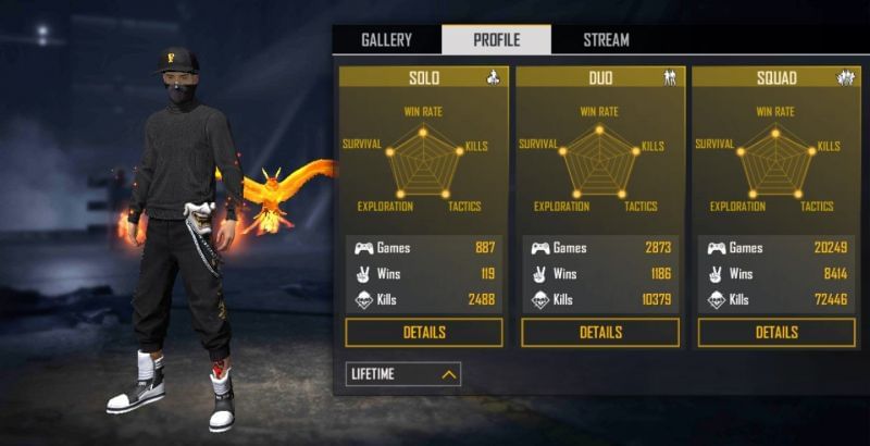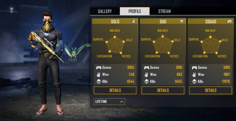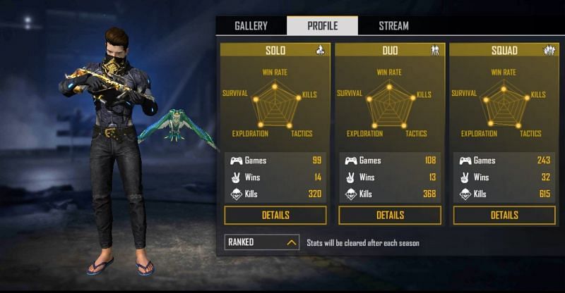 Lastly, he has appeared in 153 solo games and has 22 Booyahs for a win rate of 14.37%. In this mode, he has 377 kills for a K/D ratio of 2.88.