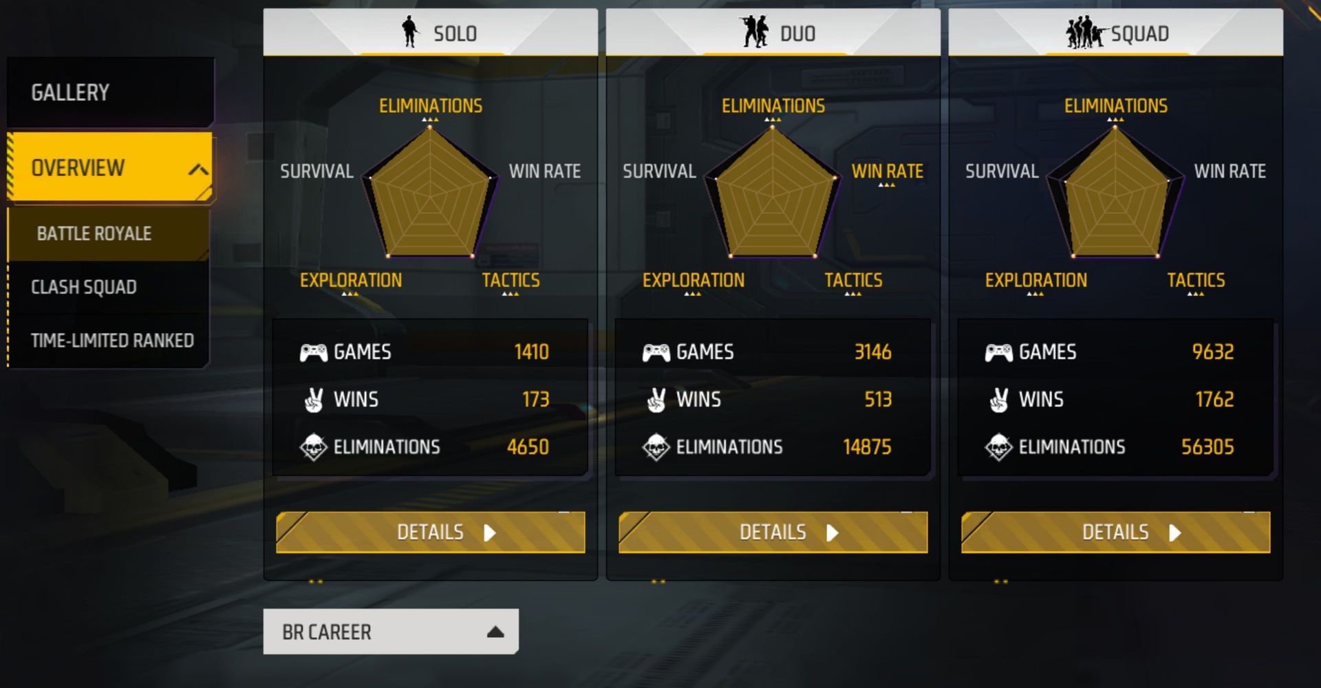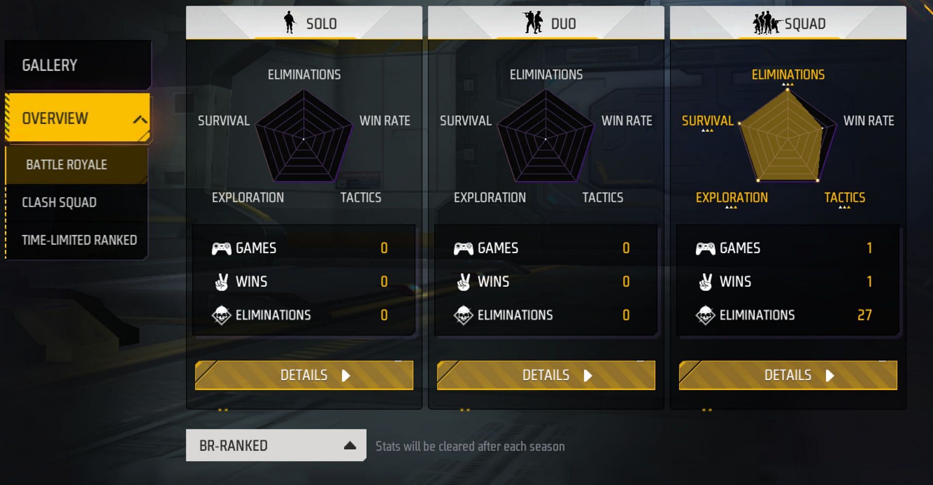 In the squad mode, he has played eight squad games and has two victories, possessing a win percentage of 25.00%. He has 49 kills for a K/D ratio of 8.17.