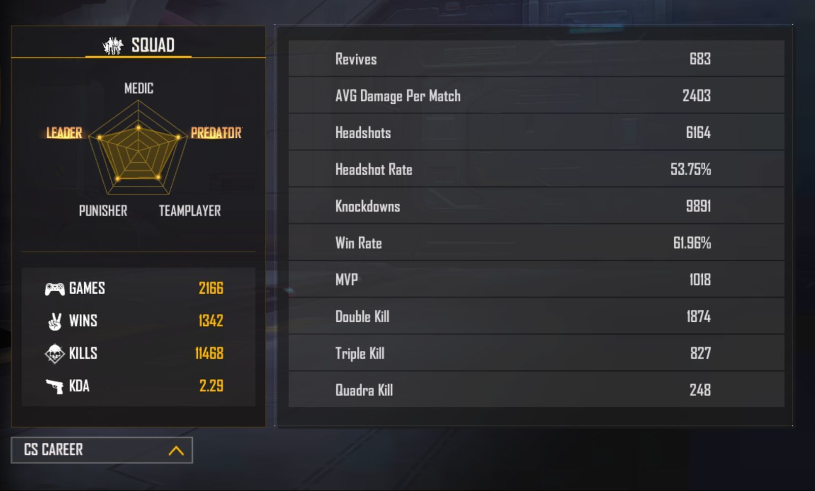 Bharat has featured in 2166 Clash Squad games in the battle royale title and has bettered the opposition 1342 times, registering a win rate of 61.95%. He has also amassed 11468 eliminations while scoring 6164 headshots for a KDA of 2.29 and a headshot ratio of 53.75%.