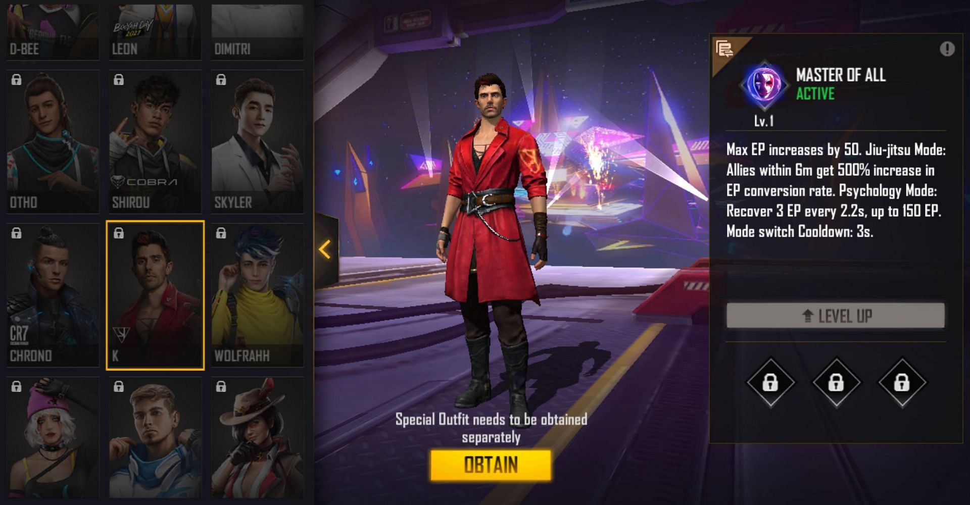At the base level, the K character increases the maximum EP by 50. It further possesses two distinct modes – Jiu-jitsu and Psychology.