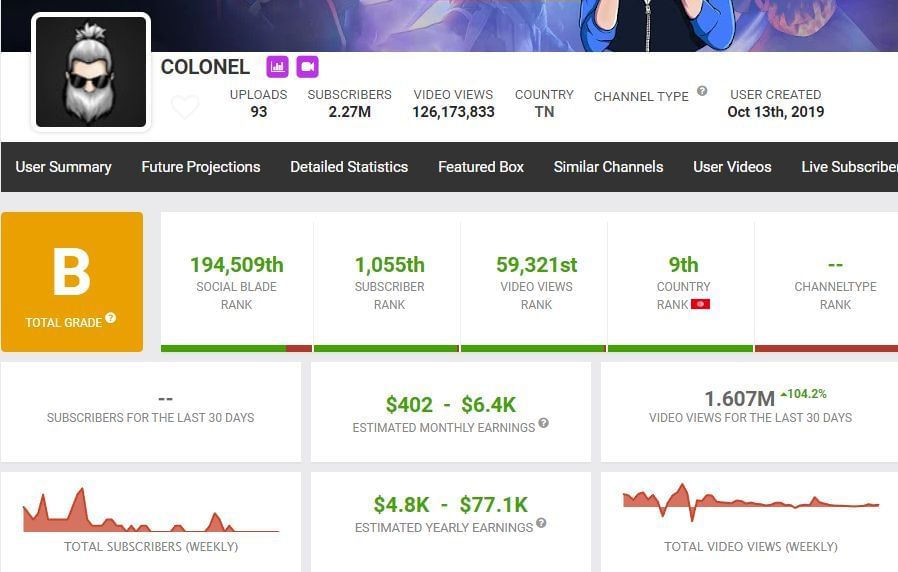 The oldest video on Colonel’s channel went live in January 2020. The player occasionally uploads montages and has around 93 montages which have gained 126 million views. The user has 2.27 million subscribers and is ranked ninth in Tunisia.