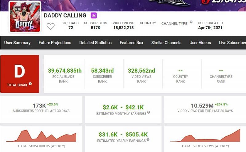 According to Social Blade, Daddy Calling’s monthly earnings are predicted to be between $2.6K and $42.1K, while his annual earnings are estimated to be from $31.6K to $505.4K.
