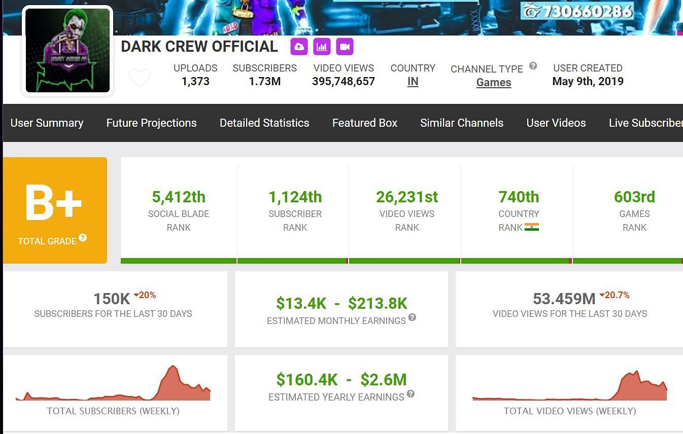 According to Social Blade, the DARK CREW OFFICIAL channel has acquired 150k subscribers and 53.459 million views in the last 30 days.