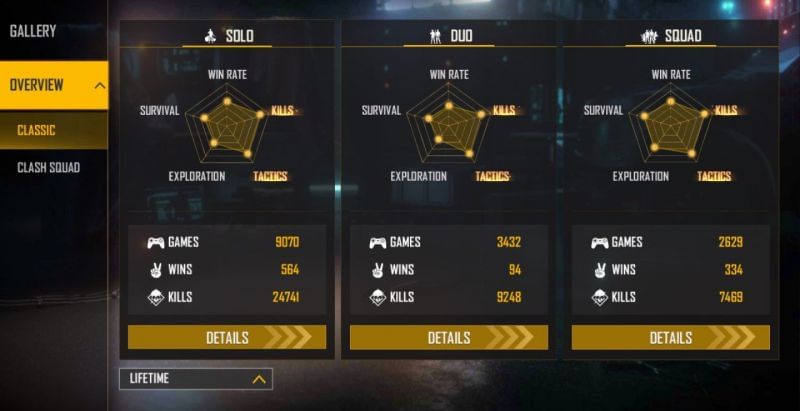 The content creator has competed in 9070 solo games and has bettered his foes in 564, maintaining a win ratio of 6.21%. He has accumulated 24741 kills, upholding a K/D ratio of 2.91.