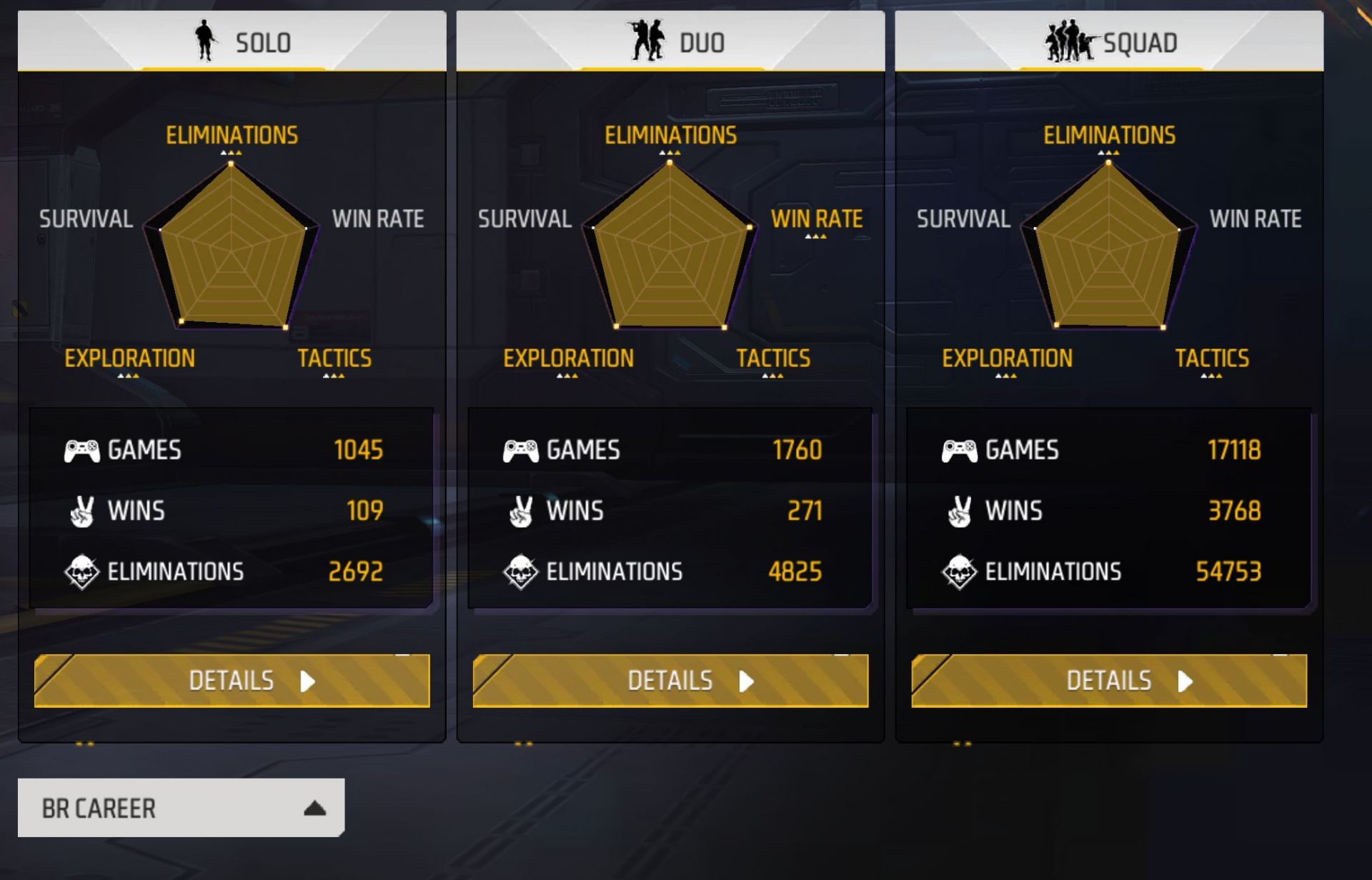 FireEyes Gaming has played 1,045 solo matches and overwhelmed the opposition to acquire 109 victories, averaging a win rate of 10.43%. With 2,692 frags and 803 headshots, he maintains a K/D ratio of 2.88 and a headshot rate of 29.83%.