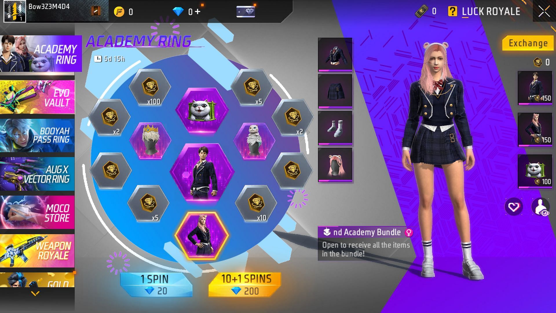 Free Fire Academy Ring is a new event that has been added to the battle royale title, and it offers the players with several themed rewards. The main attractions of the particular Luck Royale are the Style Academy and Trend Academy Bundles, which players can equip on the male and female characters, respectively. As usual, they will have to spend diamonds to draw the items from the prize pool.