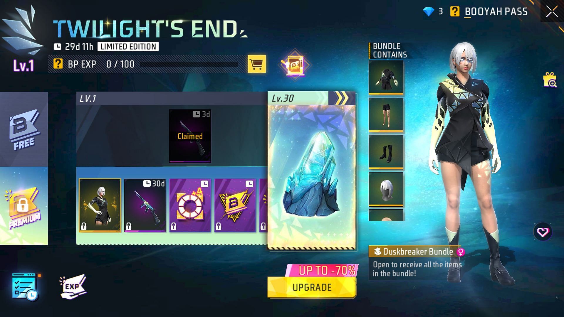 - Booyah Pass Level 100: Dawnbreaker Bundle + Cube Fragment + 20% Discount Privilege