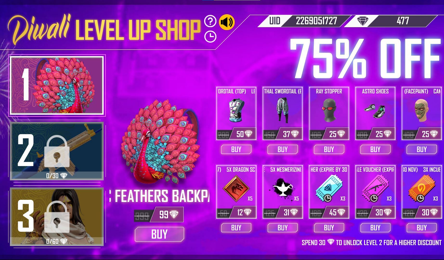 Step 1: You must first open the Free Fire Diwali Level Up Shop interface.