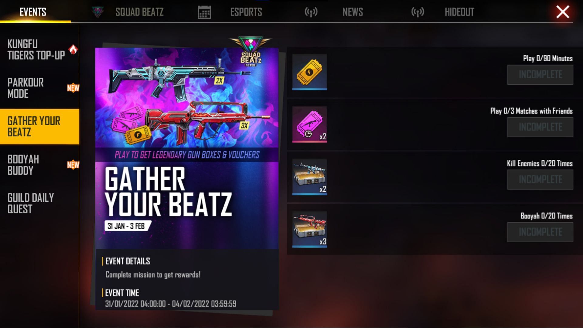 Squad Beatz event calendar in Free Fire for February