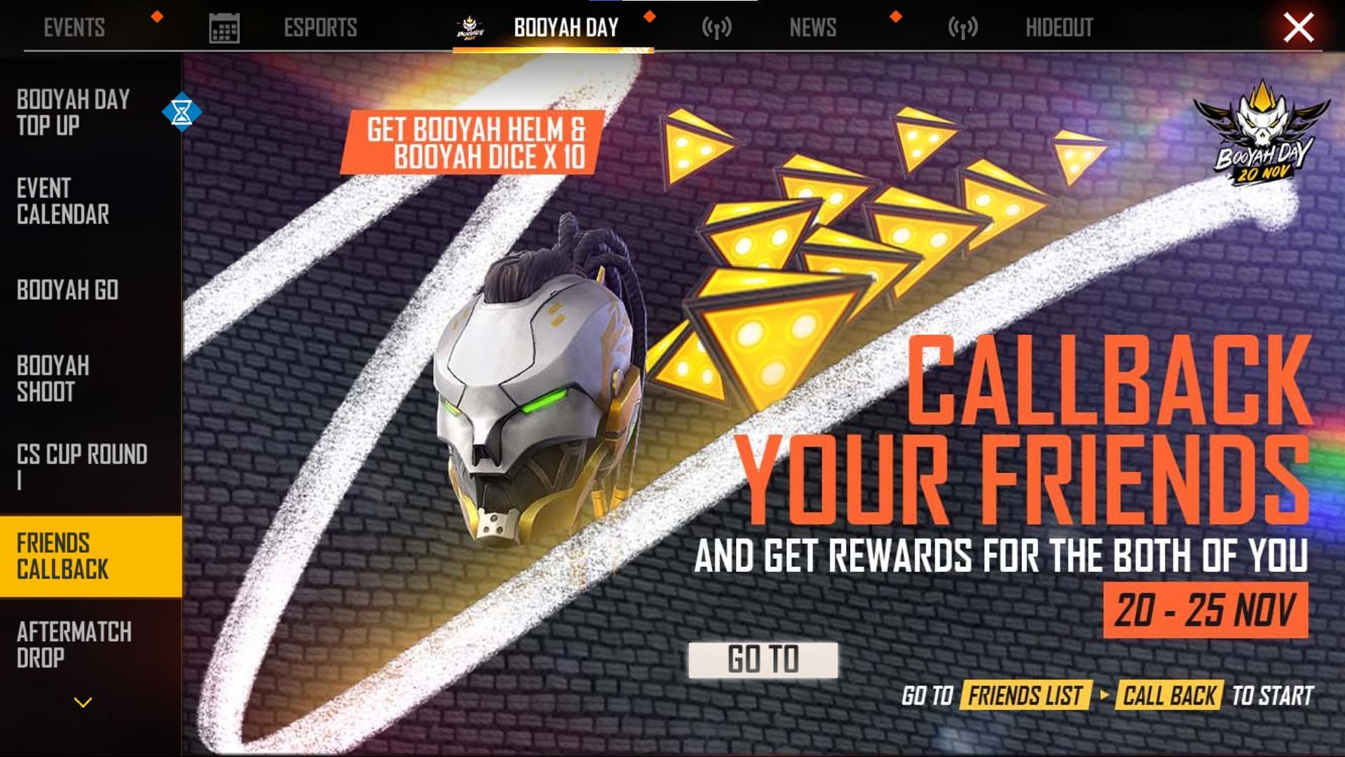 - Callback 3 friends to receive Booyah Helm and 10x Booyah Dice.