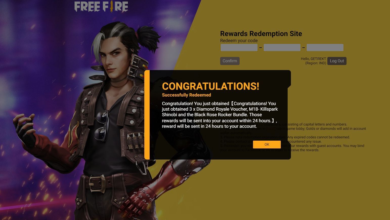 Today's Free Fire Indian server redeem code will reward players with M14 Killspark Shinobi gun skin and more