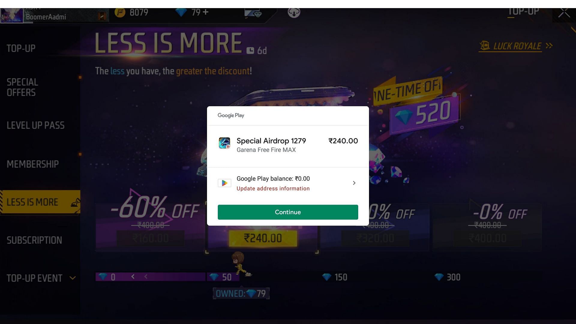 Garena will credit the diamonds to your account immediately after the payment has been made. The event provides a cheap option for individuals to acquire premium in-game currency at a much lower rate. In each of the cases, the price per diamond comes down to ₹0.307, ₹0.4615, ₹0.615, or ₹0.769.