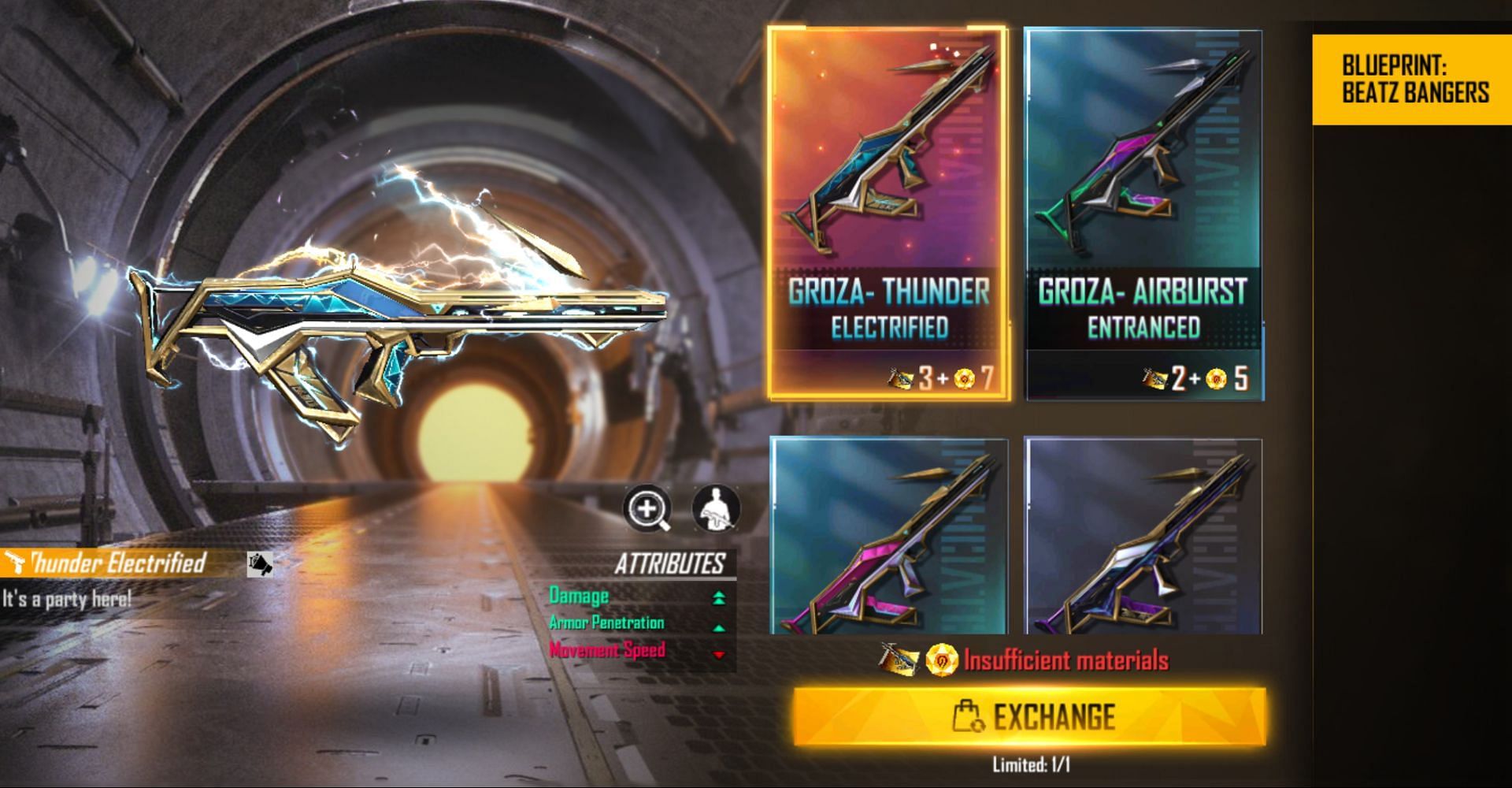 - Exchange 3x Blueprint: Beatz Bangers + 7x Evolution Stone for Groza Thunder Electrified