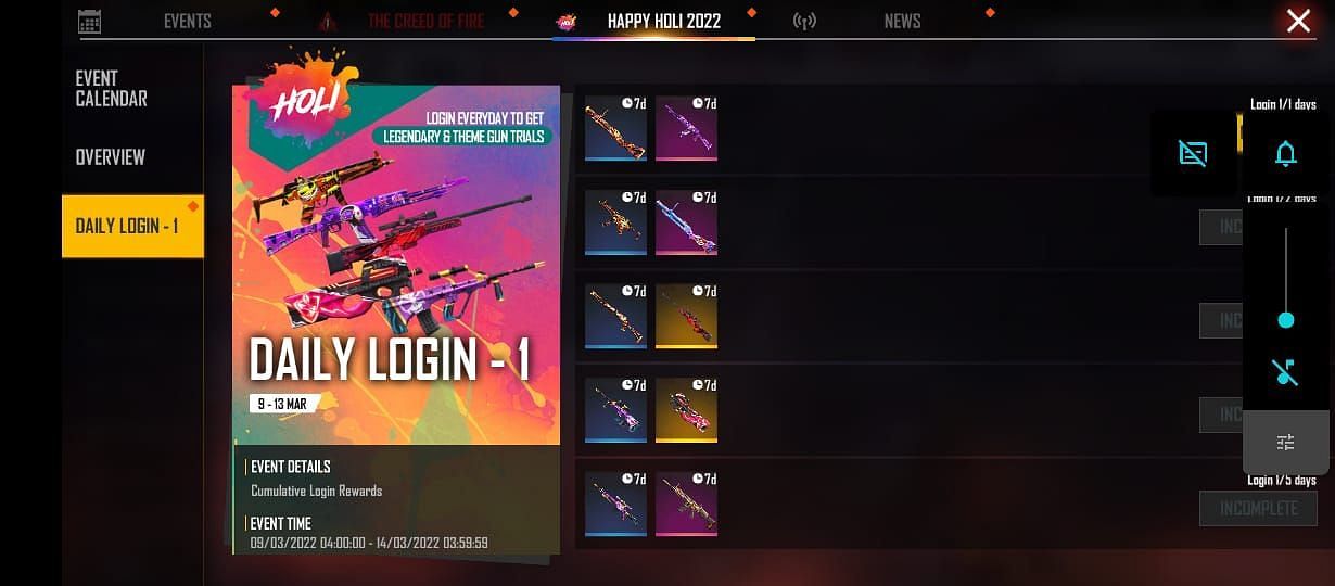 Out of the list of events given above, the Gather Balloons, Make a Splash, and Log-In events have already started in Free Fire MAX. Players can log in to the battle royale game and head over to the “Happy Holi 2022” section to claim their log-in reward for today.