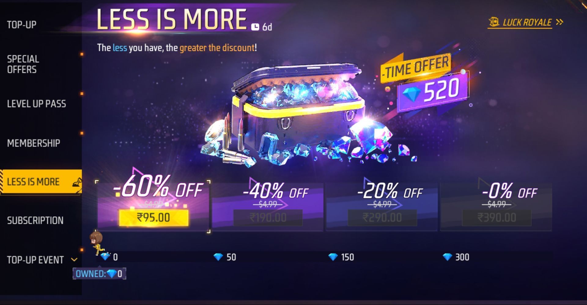 The Less is More event began recently in Free Fire MAX and will run until 25 September 2022. There are three discounts available in the event. Players with less than 50 diamonds, 150 diamonds, and 300 diamonds will get a 60%, 40%, and 20% discount, respectively.