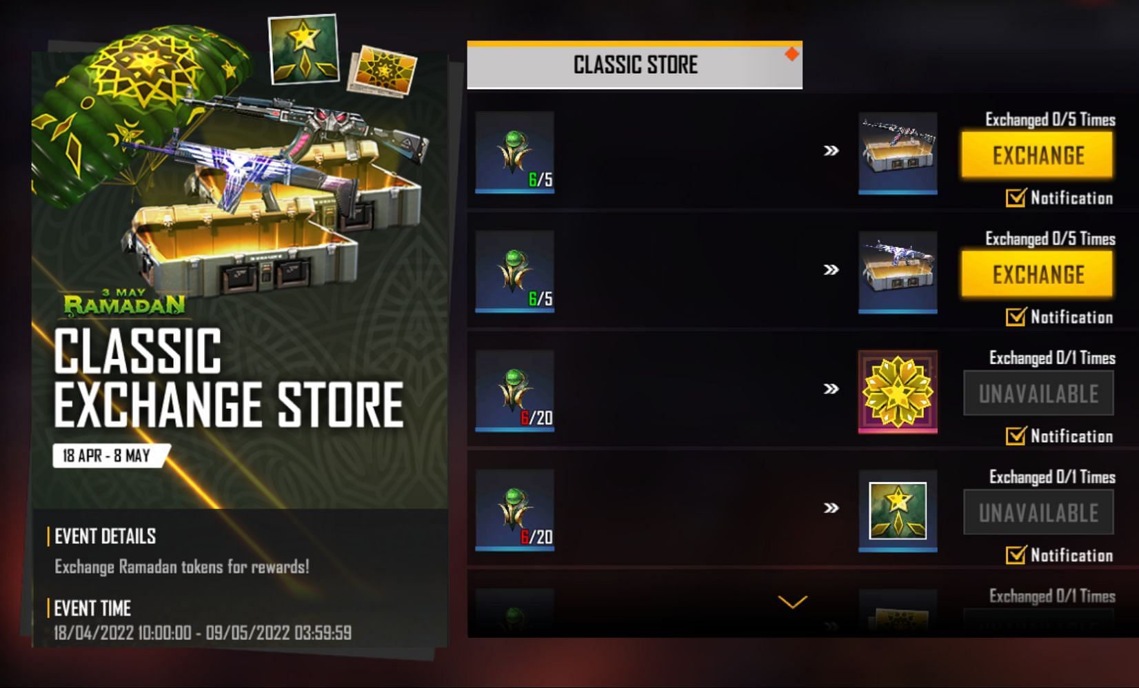 Gamers can stockpile these tokens and exchange them for items in the Classic Store and Premium Store, with the latter scheduled to start on 30 April. Currently, users can get the following items: