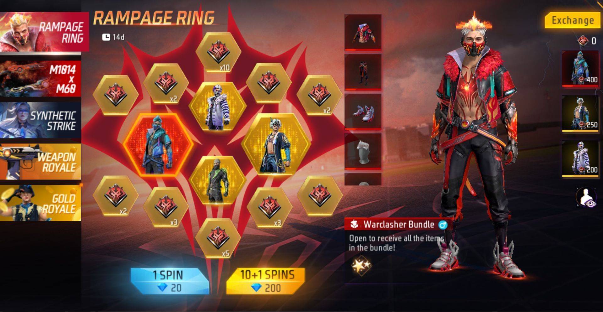 Free Fire MAX Rampage Ring was added to Free Fire MAX on August 12, 2023, featuring the entire collection of Rampage-themed outfits as the rewards. You need to spend 20 diamonds on a single spin, while the 10+1 spins are offered at 200 diamonds.