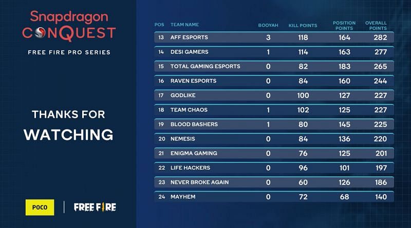 The final week of the Free Fire Pro Series league stages will be held from 4 to 6 October. After the third week, the top six teams will advance to the grand finals, while the bottom six teams will be eliminated. Those teams ranked 7 to 18 would be pushed to the Wildcard stage, from where only six of them would qualify for the finals.