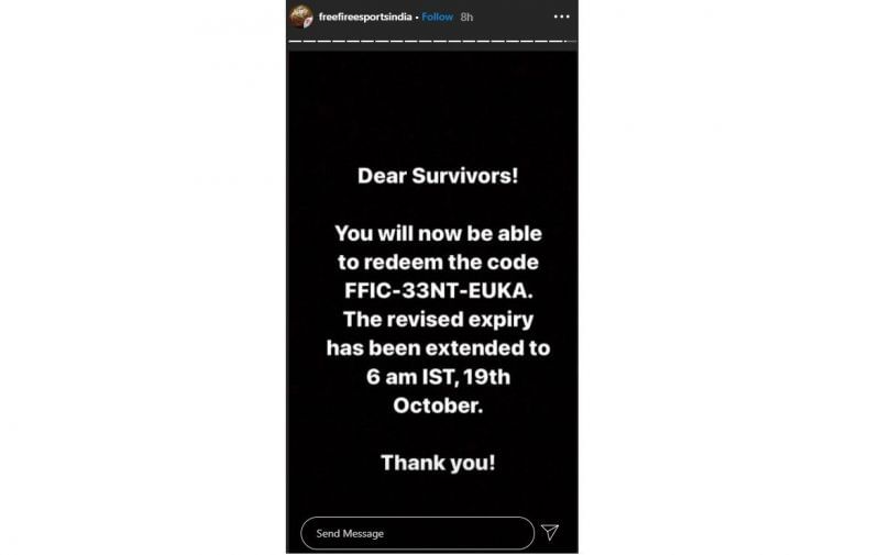 "Dear Survivors! You will now be able to redeem the code FFIC-33NT-EUKA. The revised expiry has been extended to 6 am IST, 19th October. Thank You!"