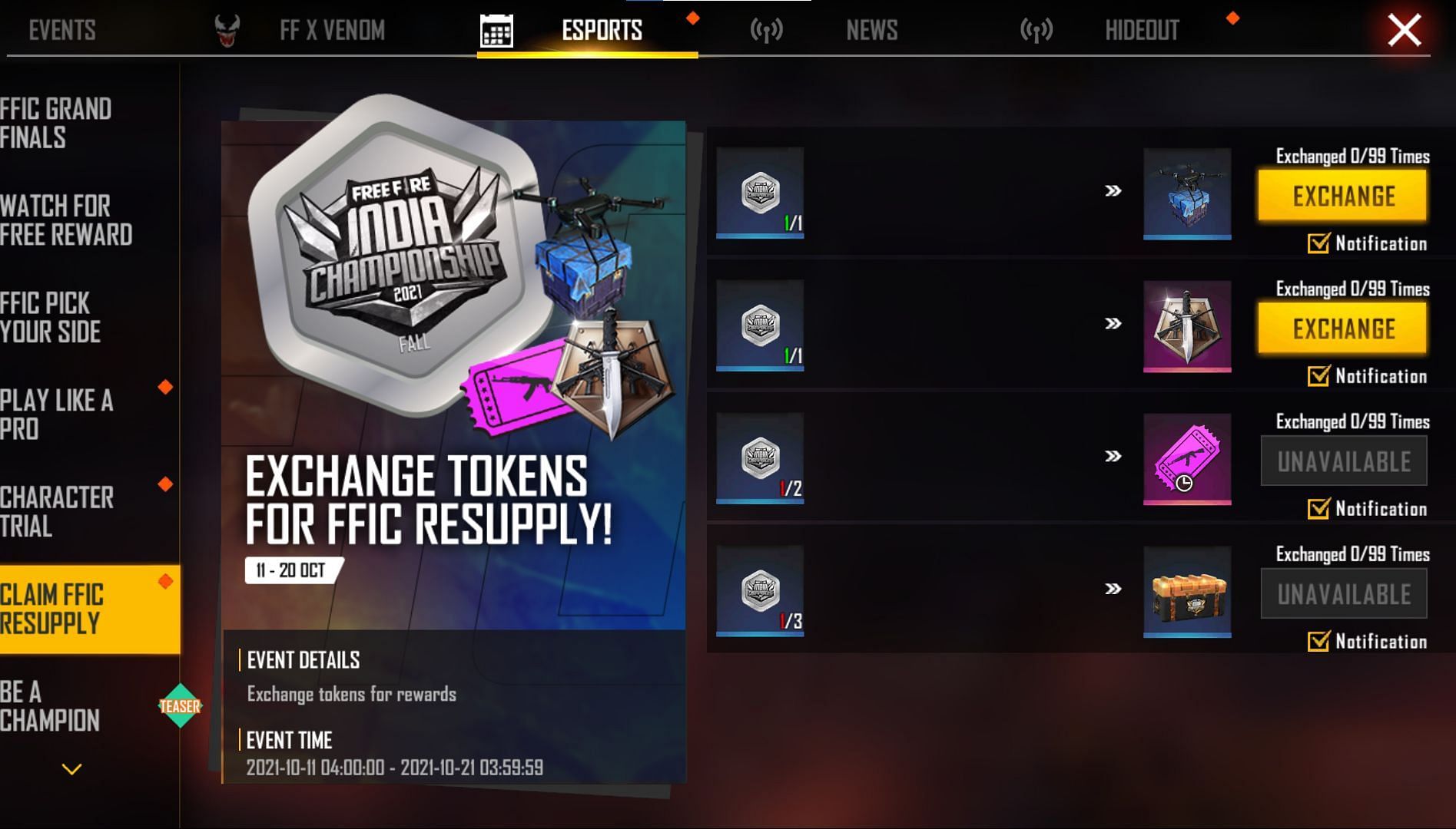This event requires players to use the collected FFIC Silver tokens to claim the rewards. The items include Bounty Tokens, FFIC Chest, Supply Airdrop, and Weapon Royale Vouchers.