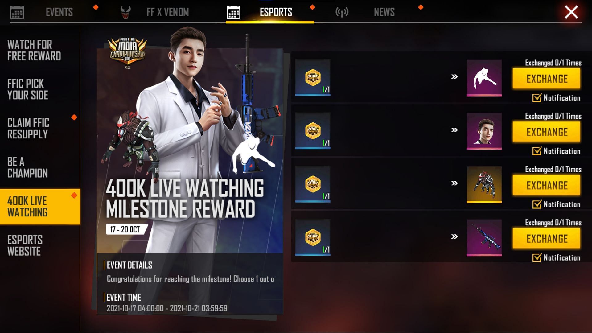 Garena released a redemption code as all viewership milestones for the Free Fire India Championship were surpassed. The code is valid until 2:00 pm IST on 18 October 2021 and offers numerous rewards.