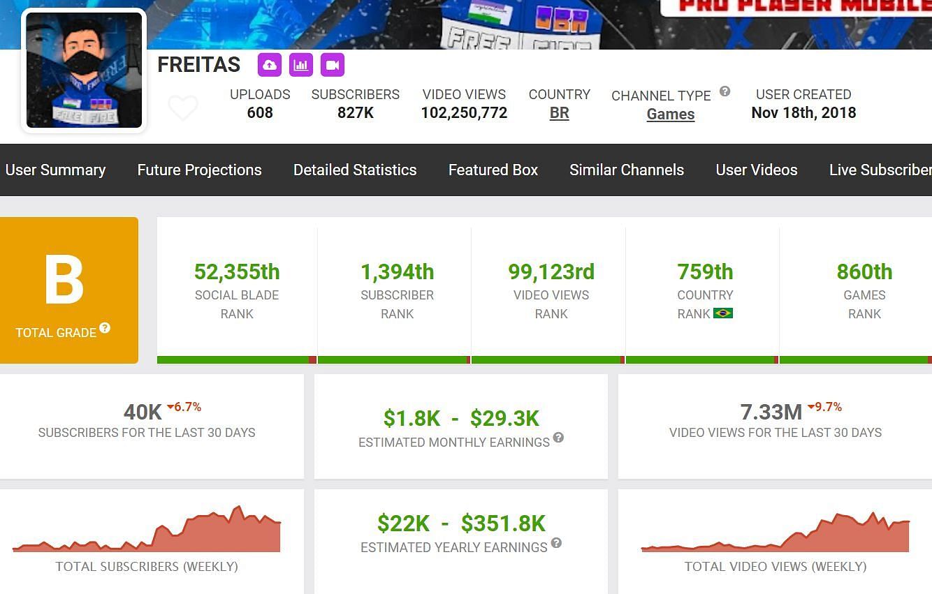 Freitas’s monthly YouTube earnings through his channel are between $1.8K and $29.3K. Meanwhile, the content creator’s yearly income ranges from $22K to $351.8K. (Source: Social Blade)