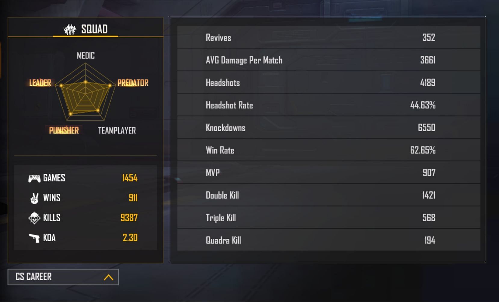 He has been engaged in 1454 Clash Squad games and has bagged 911 victories, resulting in a win percentage of 62.65%. With 9387 eliminations, the player maintains a KDA of 2.30 and an average damage per match of 3661.