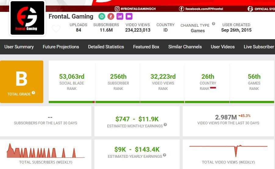 According to Social Blade, Frontal Gaming's estimated monthly earnings are believed to be between $747 - $11.9K. The yearly approximated figures lie around $9K - $143.4K.