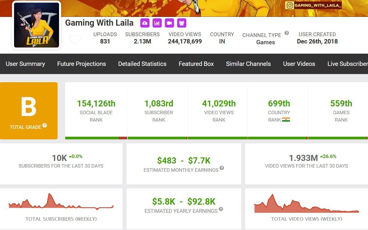 As per the estimates posted on Social Blade, Mansha Rathore’s monthly income from the Gaming with Laila YouTube channel is around $483 and $7.7K. The approximate figures for the entire year lie between $5.8K and $92.8K.