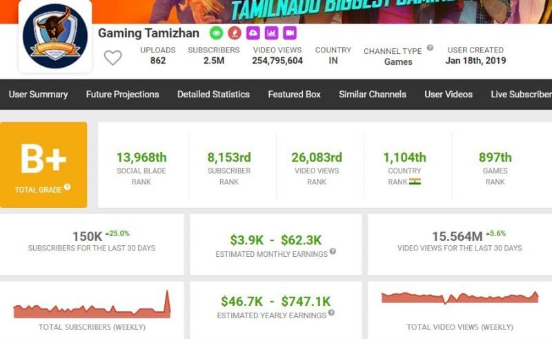 According to Social Blade, Gaming Tamizhan has gained 150k subscribers and 15.56 million views in the last 30 days.