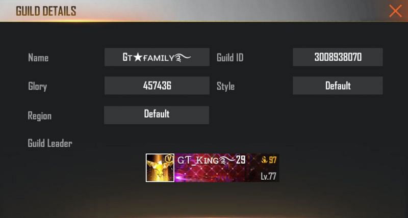 GT King is part of the 'GT Family' guild in Free Fire. The guild's ID is 3008938070.