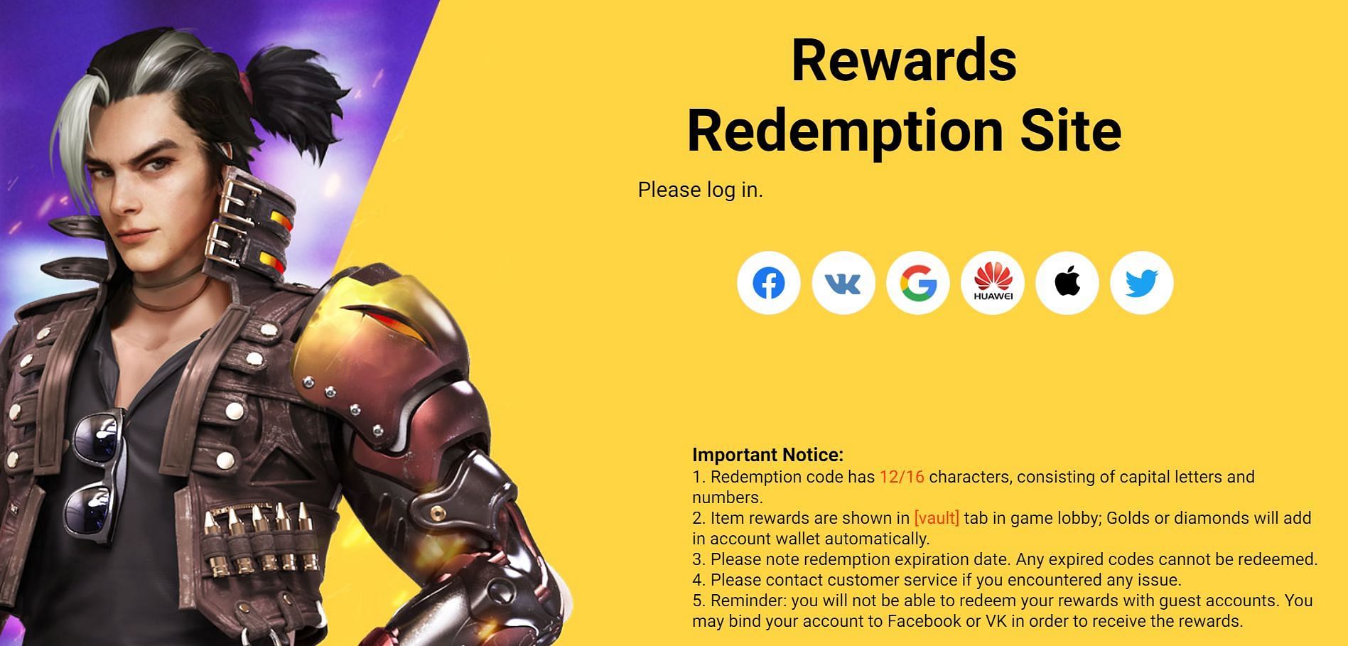 Step 3: Once users land on the given webpage, they must sign in to their Free Fire account. The available options are Facebook, Google, VK, Twitter, Apple ID, and Huawei ID.