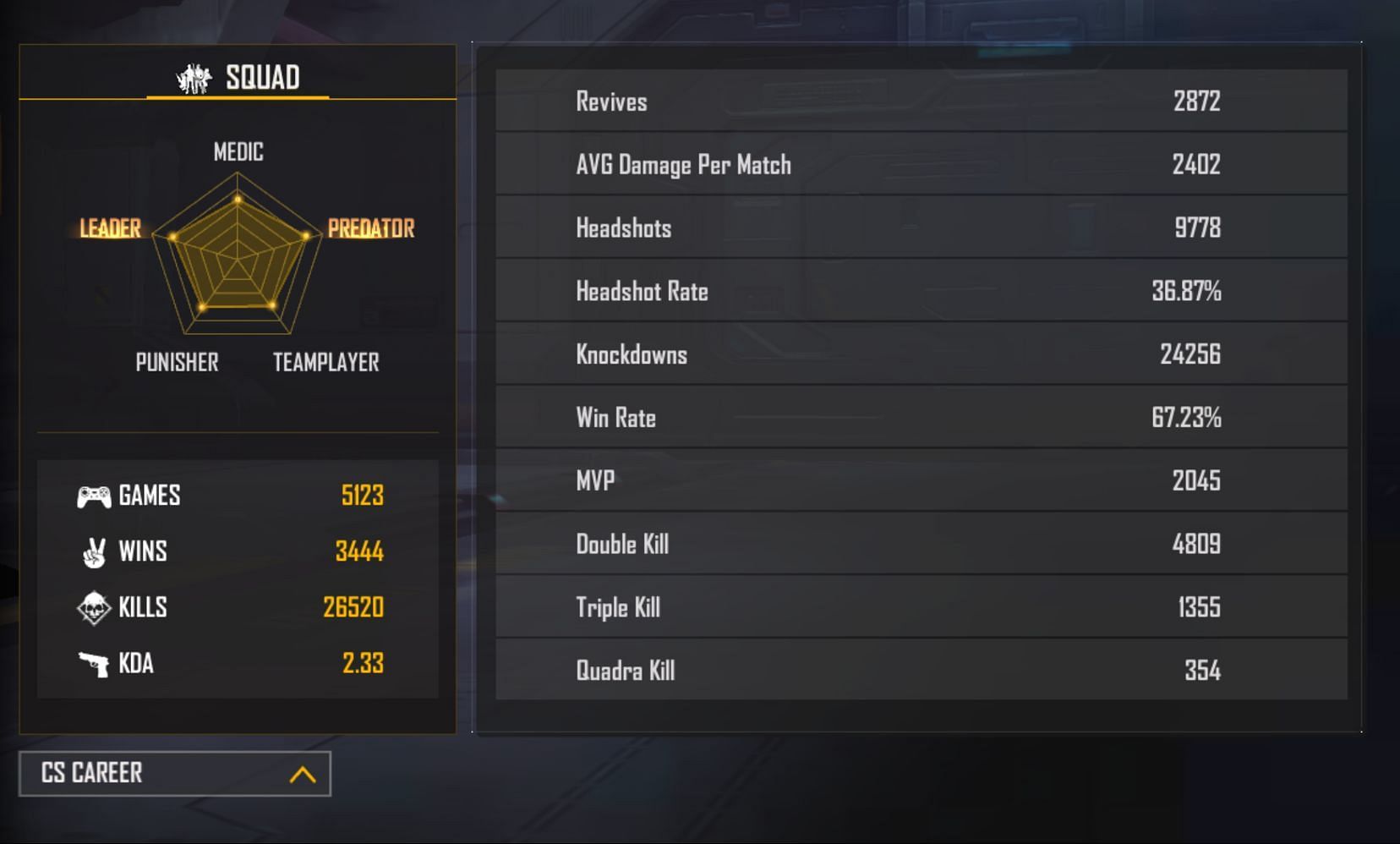 GT King has participated in 5123 Clash Squad matches. He has secured 26520 kills with a KDA of 2.33 and an average damage per match of 2402.