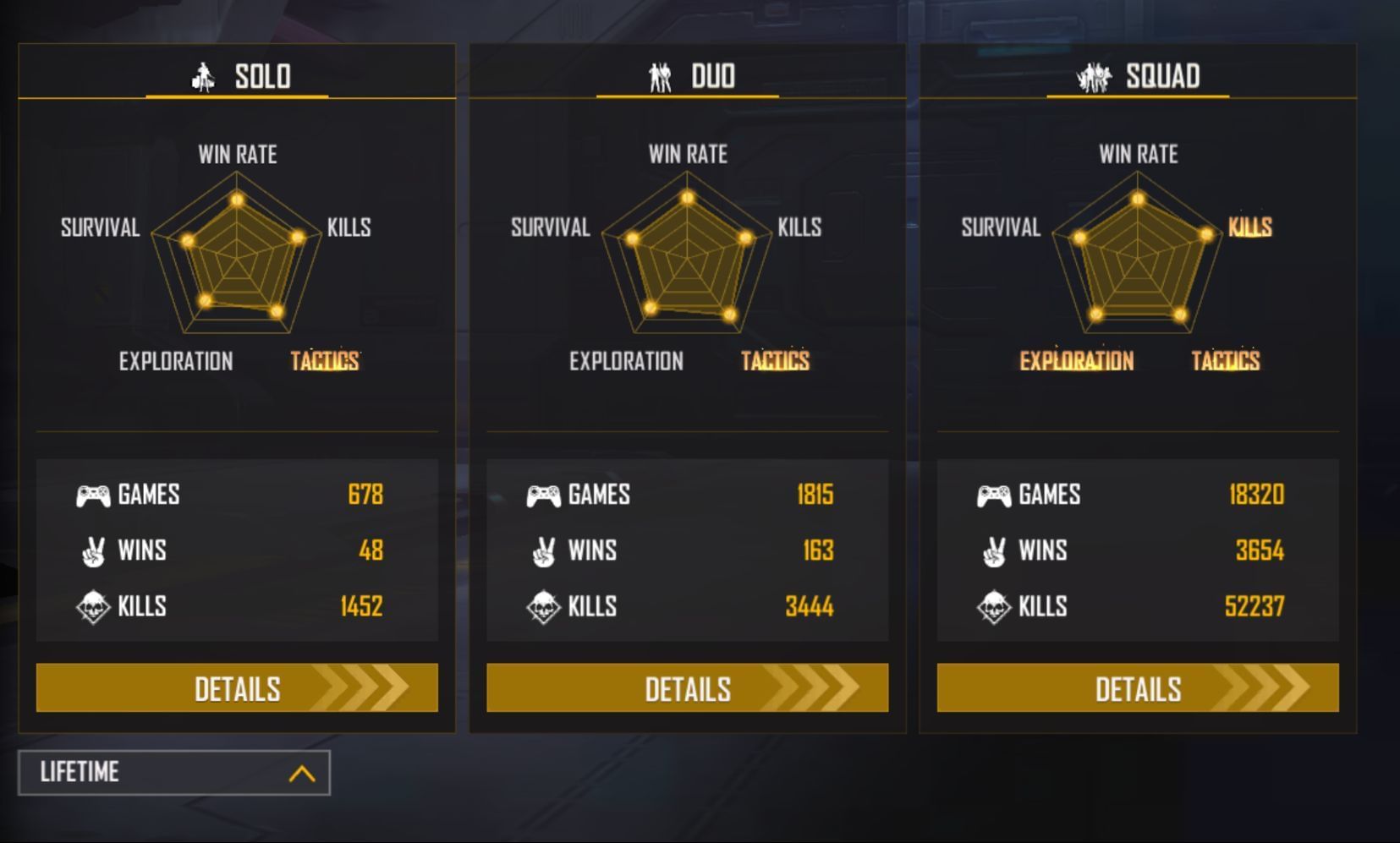 His stats in lifetime and ranked games are as follows:
