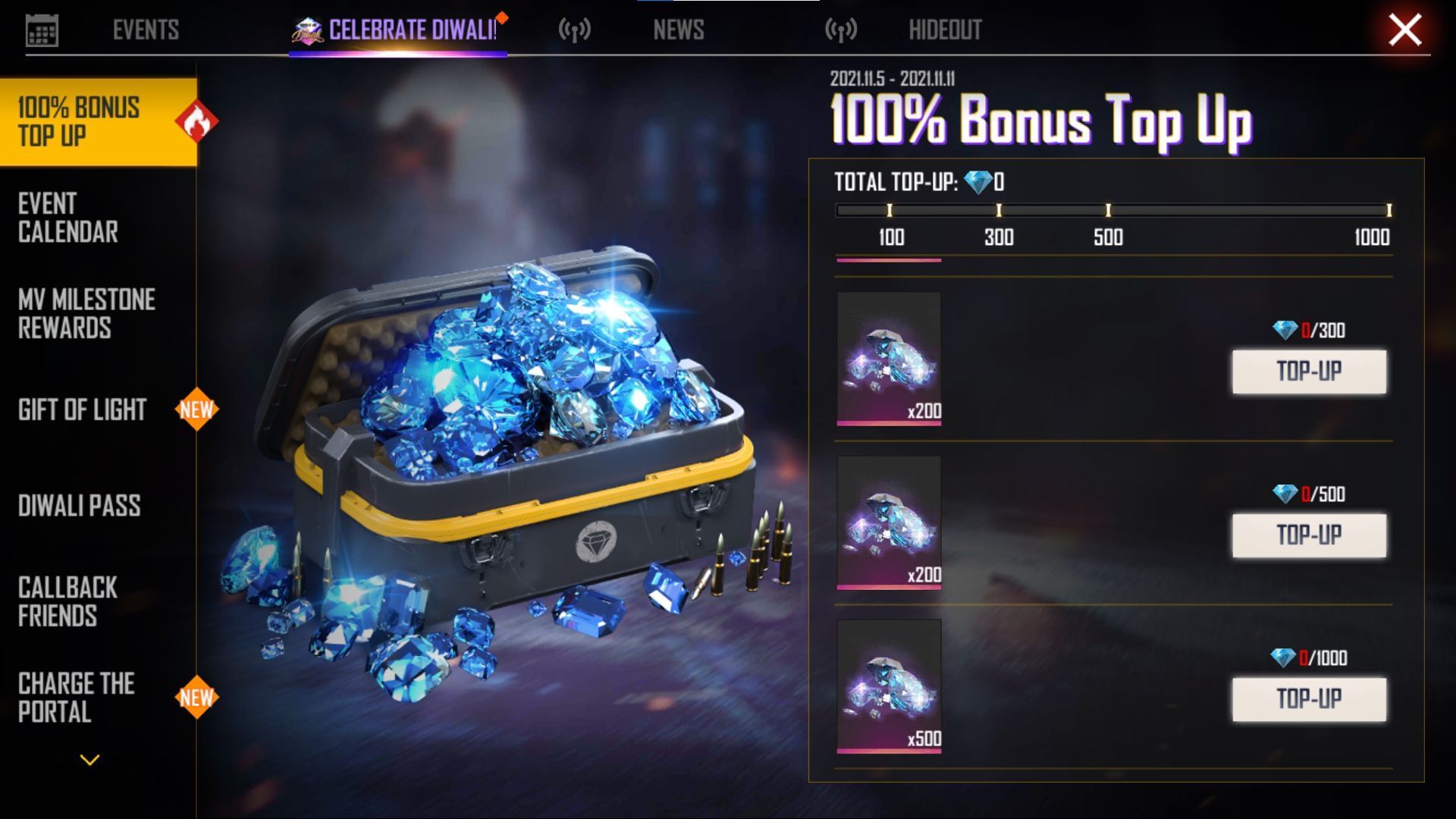 Free Fire’s Indian server has recently received a new 100% top-up bonus event as a part of the Diwali celebrations.