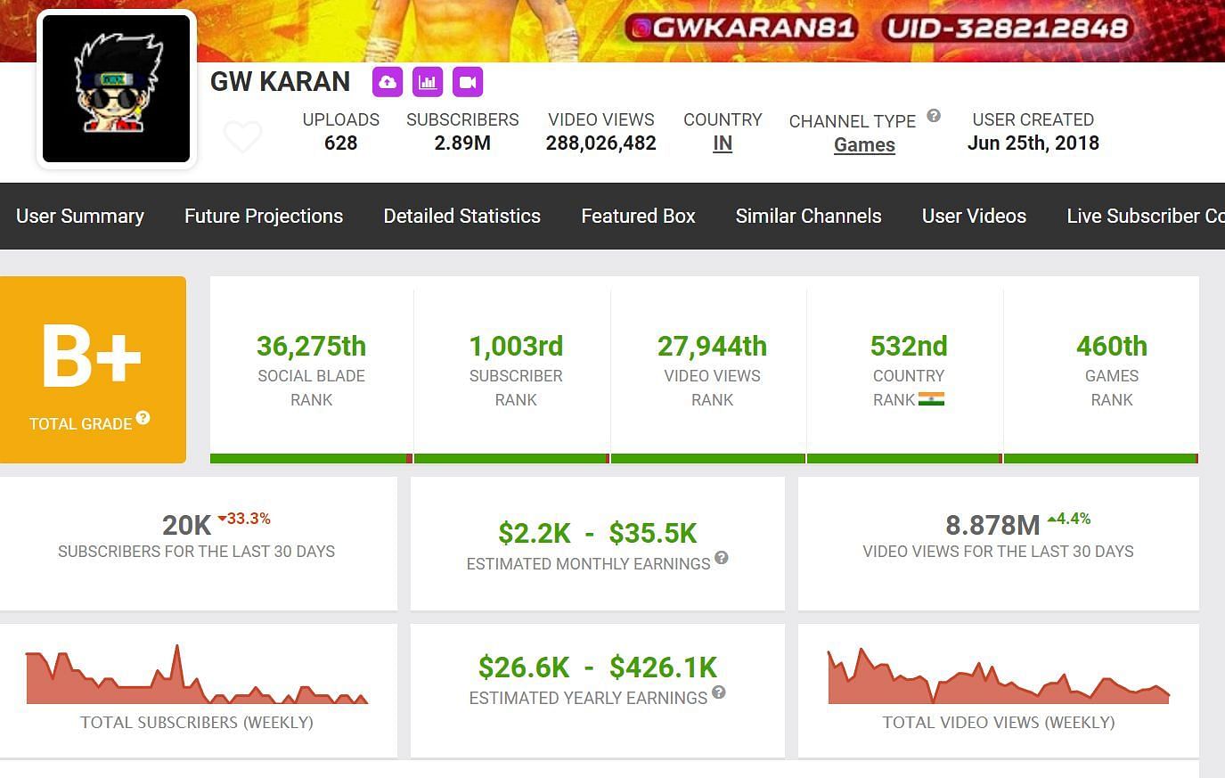 As per the official Social Blade website, the estimated monthly earnings of GW Karan are between $2.2K and $35.5K.
