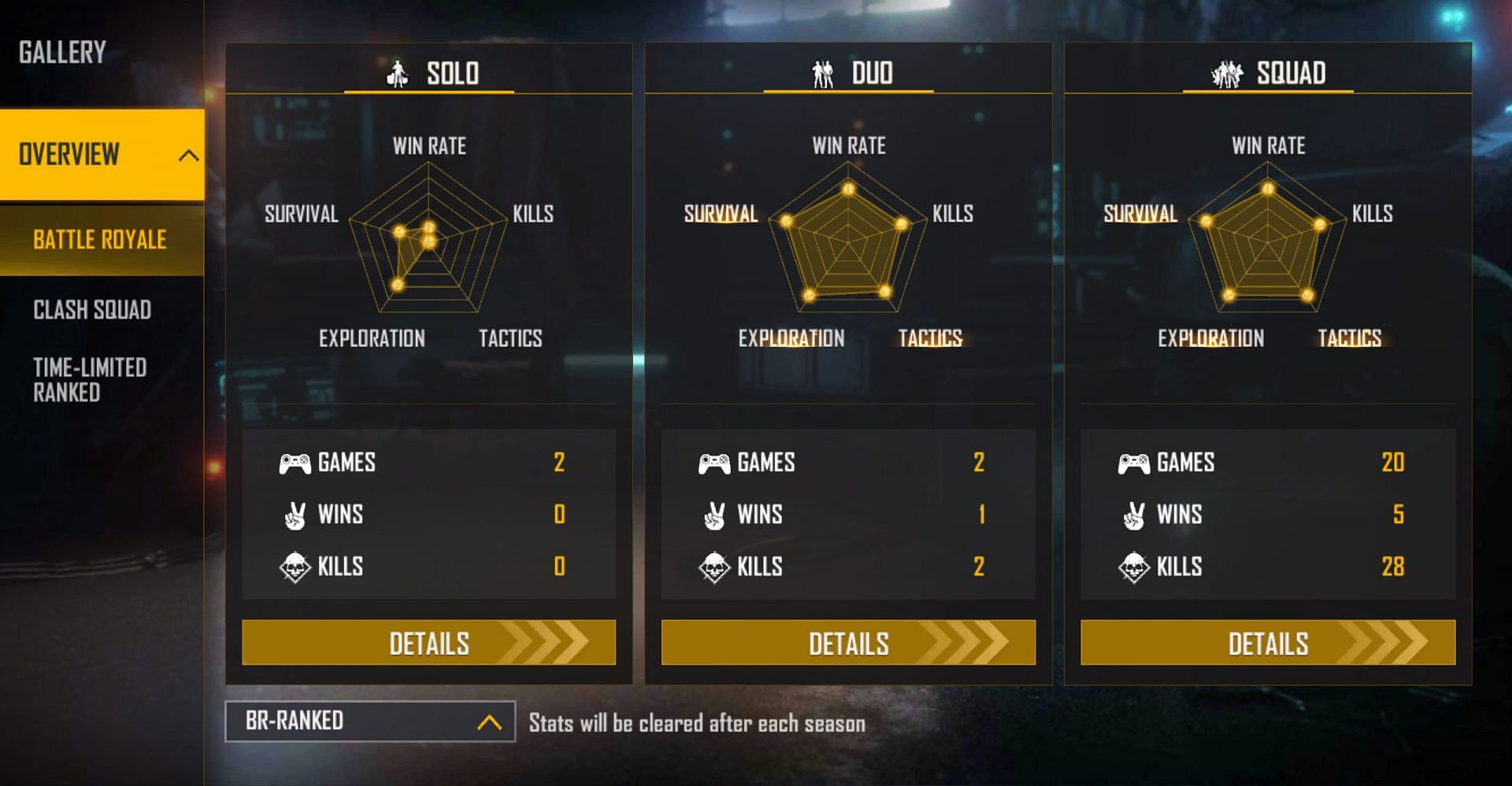 Apart from this, the content creator has featured in two duo games and has a single win, translating to a win percentage of 50.00%. He has accumulated two kills at a K/D ratio of 2.00.