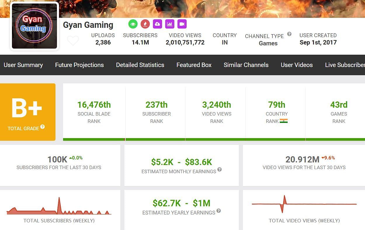 Gyan Gaming’s monthly and yearly earnings through his YouTube channel lie between $5.2K - $83.6K and $62.7K - $1 million, respectively.