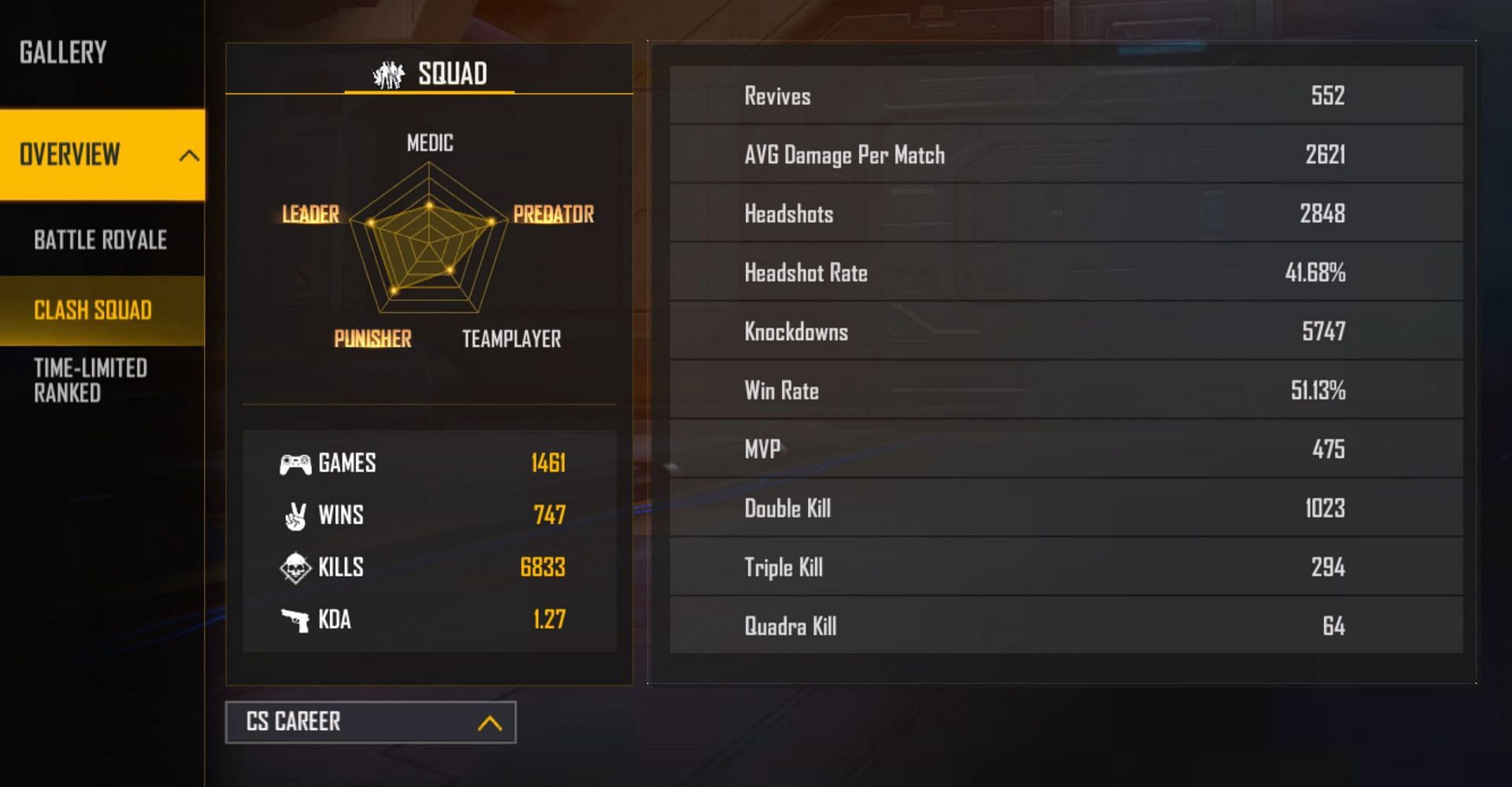 Gyan Sujan has played 1461 games in the Clash Squad mode and has 747 wins for a win rate of 51.13%. He has bagged 6833 kills with a KDA of 1.27 and has 2848 headshots with a headshot percentage of 41.68%.