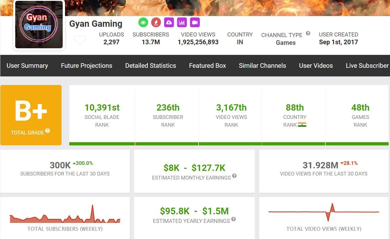 Gyan Gaming's monthly earnings through his YouTube channel are said to be between $8K and $127.7K. The yearly estimates at the given viewership levels are between $95.8K - $1.5M. (Source: Social Blade)