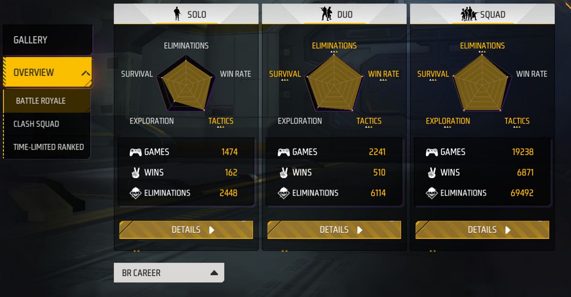 Gyan Gaming has won 6871 of 19238 squad matches for a win rate of 35.71%. He has 69492 frags and a K/D ratio of 5.62.