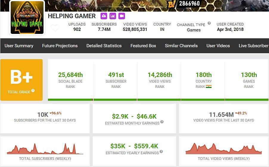 The first video on the Helping Gamer channel was released in April 2018. Over the years, Sarfraj has gained enormous popularity with his Free Fire-related videos. He currently has 7.74 million subscribers and is ranked 180 in India. In terms of total views, the tally has now surpassed 528 million.