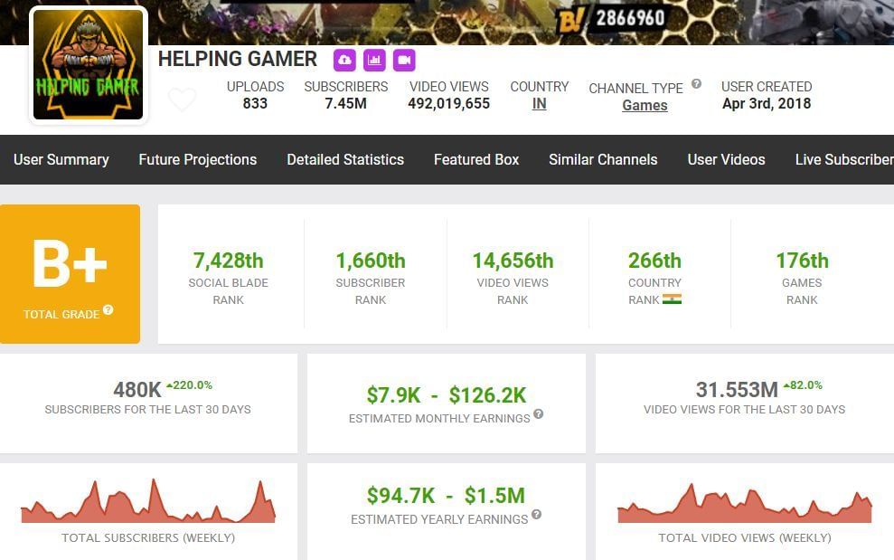 According to Social Blade, Helping Gamer is ranked 266 in the list of India's top YouTubers.