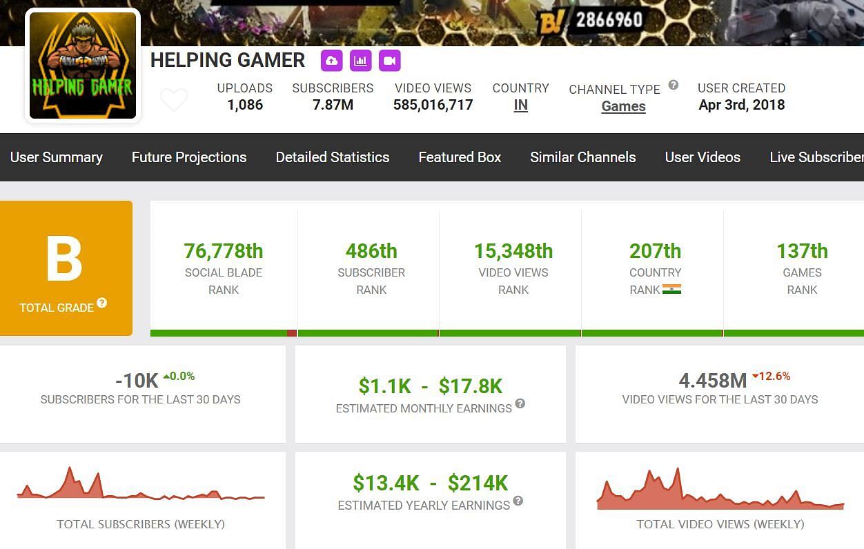 Helping Gamer’s monthly and yearly income is between $1.1K and $17.8K and $13.4K and $214K, respectively (Source: Social Blade).