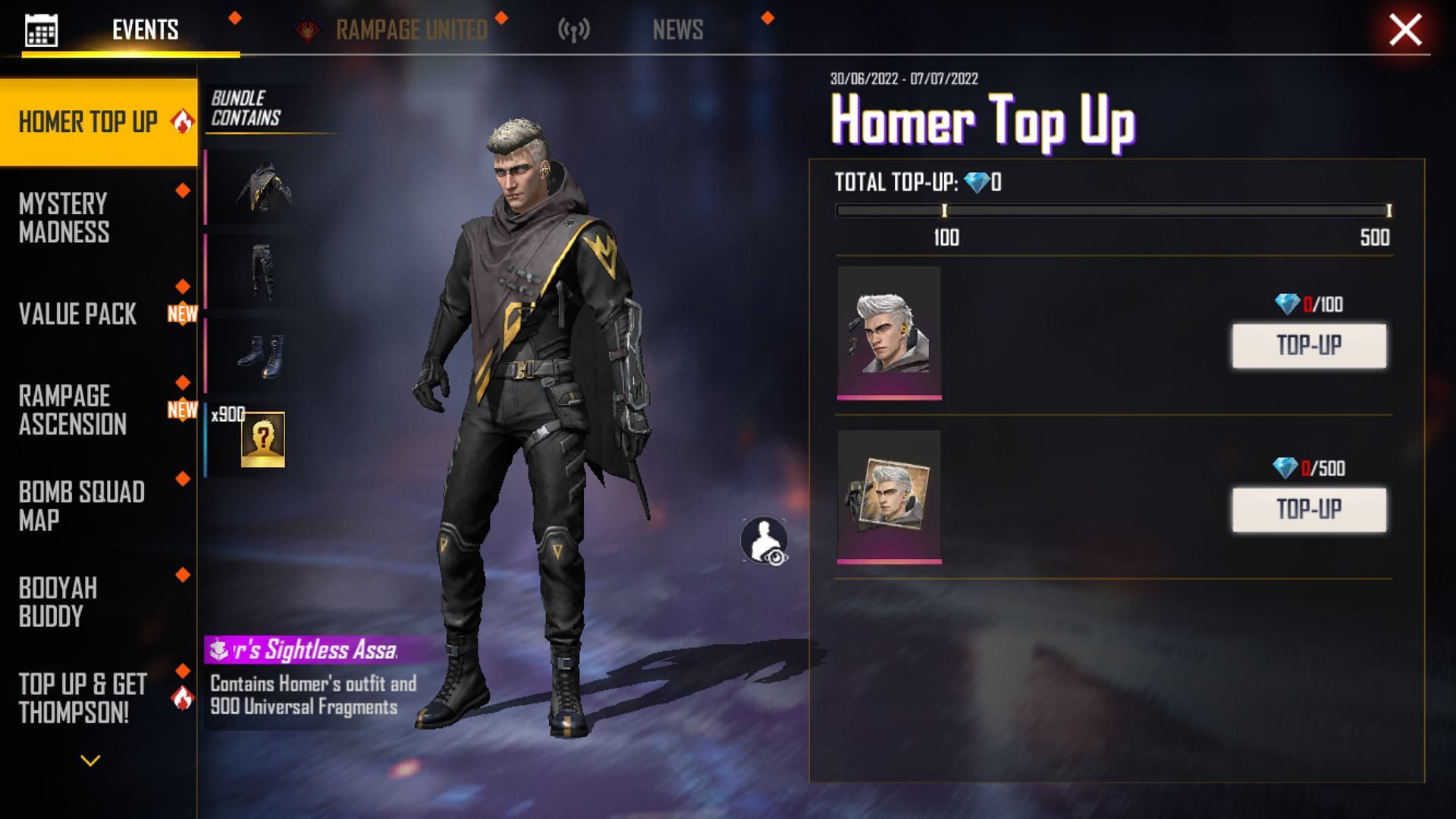 - Top-up 500 diamonds: Get Homer’s Sightless Assassin Bundle