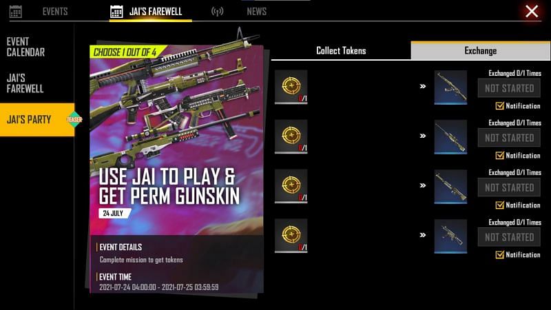 Jai’s Party event will start on July 24th and will only be available for one day. During this period, users must play a total of five games with Jai characters. This will enable them to procure a Golden Crosshair, which they can later use to obtain a permanent gun skin in Free Fire.
