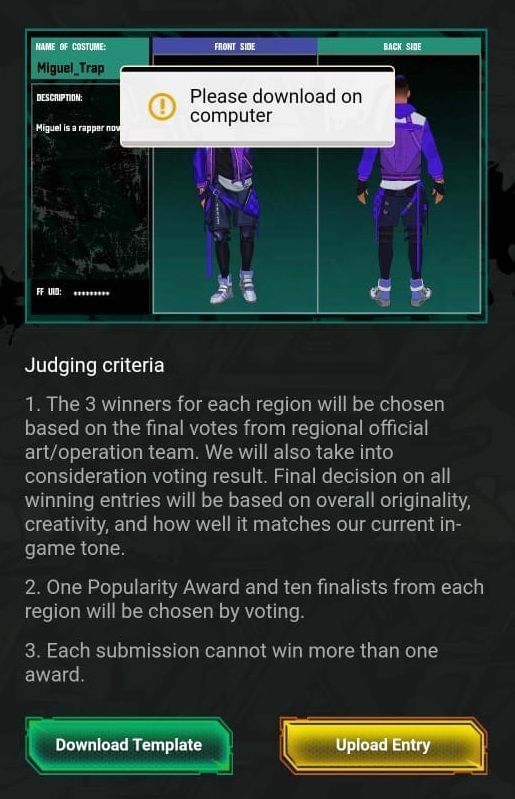 Players would have to create an outfit out of the template provided to them. They would then have to fill up the template with the FF UID, front-side and back-side view of the design. After completion of the outfit, players would have to submit it on the contest website. The deadline for the submission is 9th August.